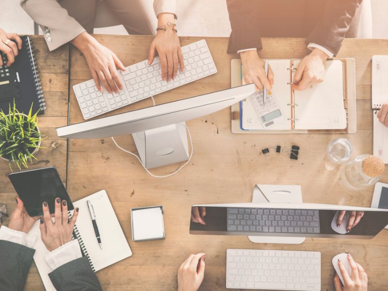 Overhead view of people working together at a table